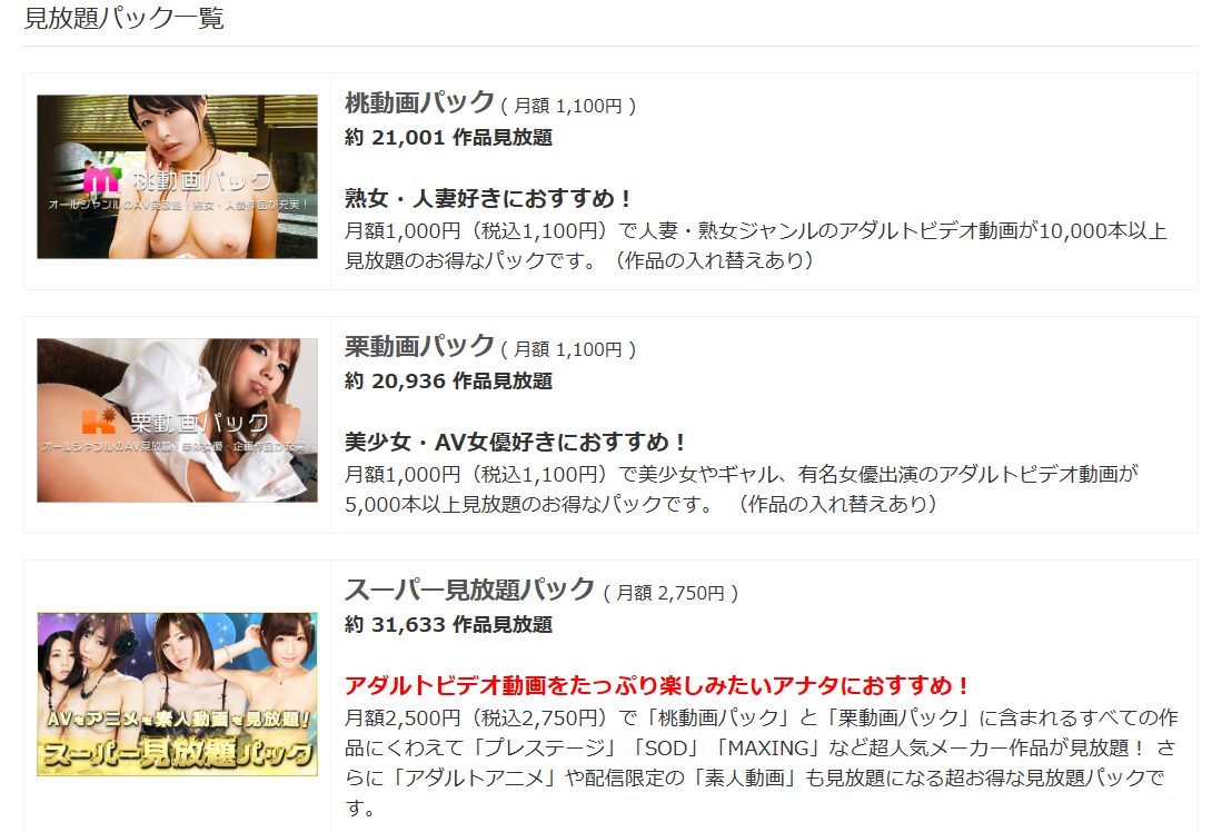 見放題のパック種類が多く取扱作品のボリュームも十分。人気メーカーの王道タイトルから、実用性重視のフェチ系まで、ラインナップも幅広いのが魅力です。
